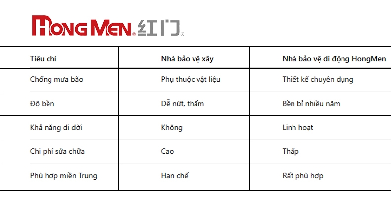 Với kết cấu vững chắc, vật liệu cao cấp, khả năng chống thấm – chống gió – chống ăn mòn vượt trội, nhà bảo vệ HongMen hoàn toàn đáp ứng và vượt qua điều kiện mưa bão khắc nghiệt của miền Trung.